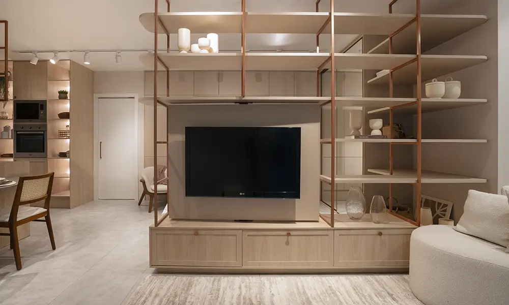 No closet, sensores de presença podem acionar luz interna de forma automática ao abrir portas ou gavetas, reduzindo consumo e aumentando praticidade. Em painéis de TV, nichos técnicos ocultam cabos, roteadores e equipamentos eletrônicos, preservando organização visual sem comprometer acesso para manutenção. Essas soluções não são aparentes à primeira vista, mas determinam a qualidade do uso ao longo do tempo.
